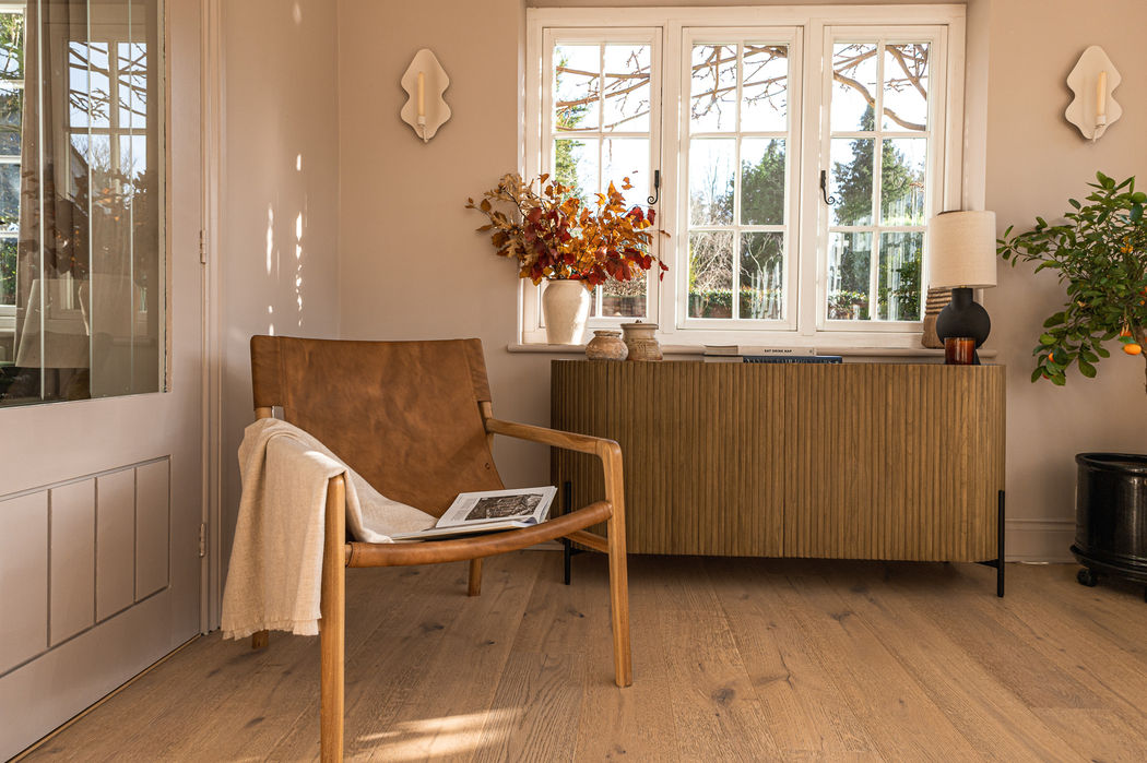 Plants were also added to give a pop of colour and bring in the rich green that surrounded the property. Team Maché then found the perfect natural plaster hue that would complement the rustic brick seen through the windows and would keep this light filled room feeling warm and inviting regardless of the great British weather.