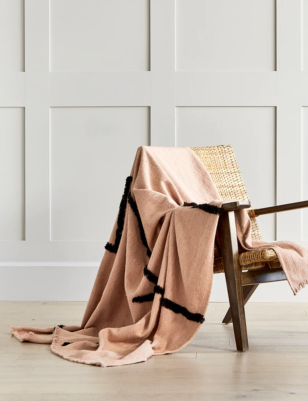 This gorgeous throw contrasts peach with a bold black tufted pattern. Drape over your bed or on your sofa to add a soft burst of colour to your room.